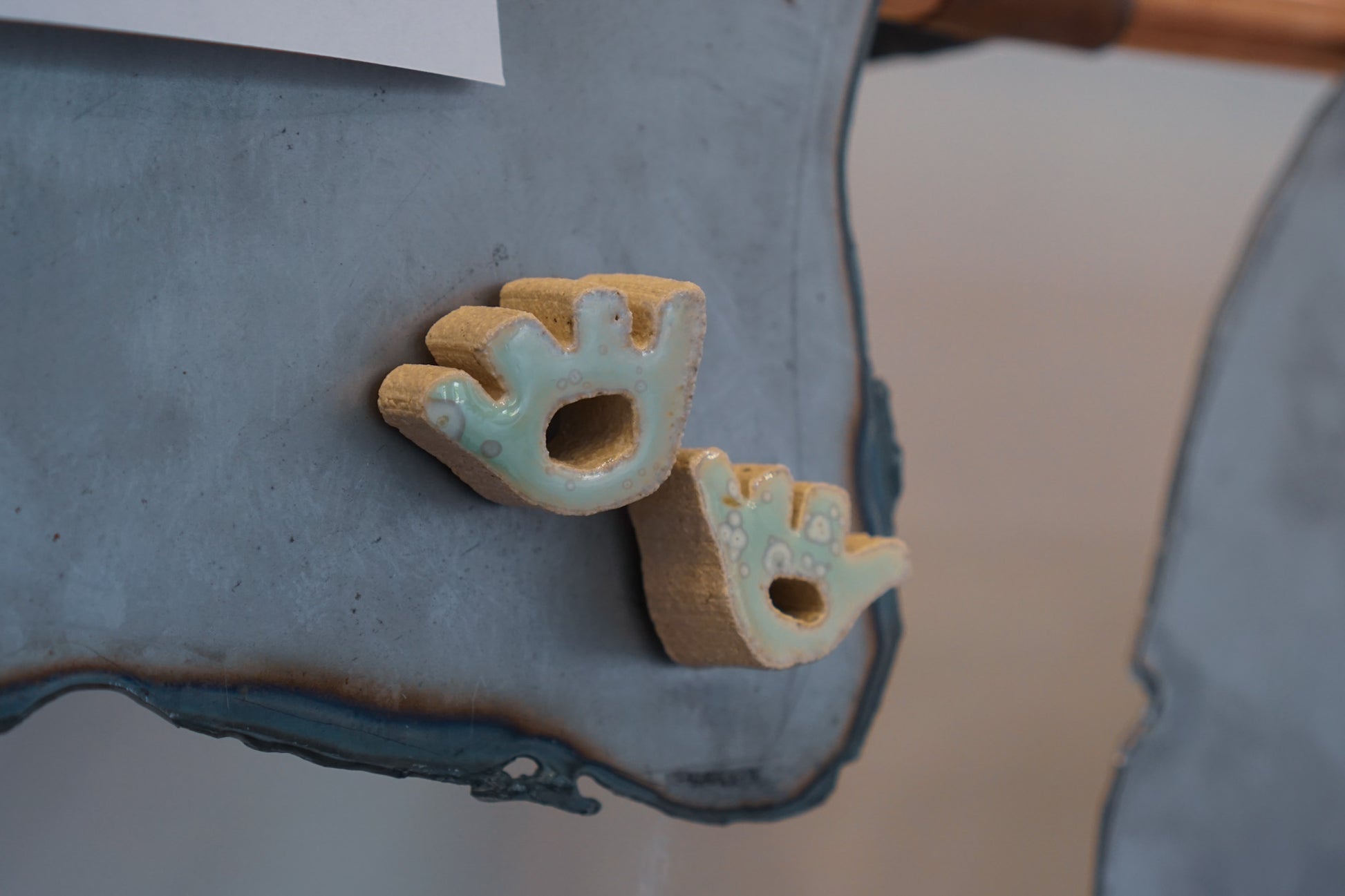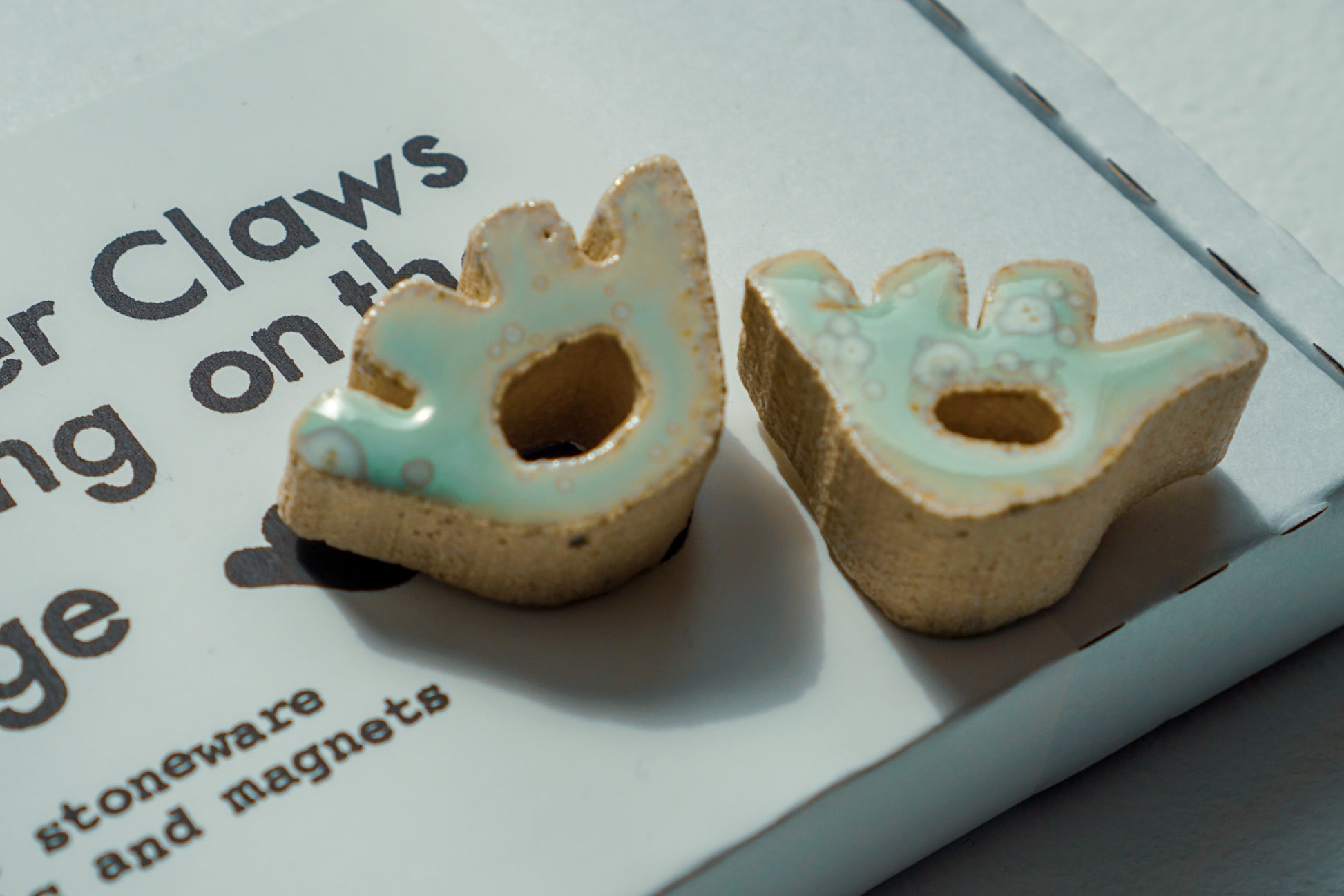 A limited edition of 40 pairs of unique ceramic stoneware magnets handmade by artist Joanne Masding during her 2025 Bluecoat exhibition, The Moveable Scene of the Page.